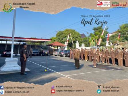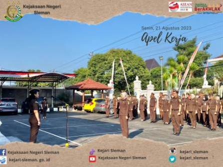 Kepala Sub Bagian Pembinaan pada Kejaksaan Negeri Sleman Suryanto, S.H. pimpin Apel Kerja pada hari Senin, 28 Agustus 2023 yang diikuti oleh seluruh pegawai. #terusbergerakdanberkarya #adhyaksa #trapsilaadhyaksa #banggamelayanibangsa #kepastianhukumhumanismenujupemulihanekonomi #KejaksaanRI #JaksaAgung #KejaksaanTegas #KejaksaanTakPandangBulu #penguatanbirokrasi ...
