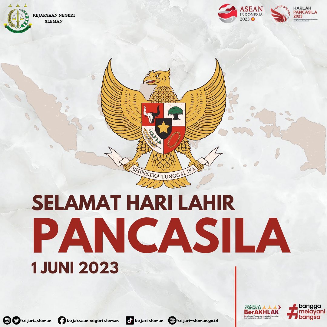 Kepala Kejaksaan Negeri Sleman, Widagdo, S.H. beserta jajaran mengucapkan :Selamat memperingatiHari Lahir Pancasila Tahun 2023Mari kita abadikan semangat persatuan dan kesatuan NKRI dengan nilai luhur bangsa kita Pancasila.#kejaksaanri #kejaksaan #kejatidiy #kejarisleman #harilahirpancasila#2023 ...
