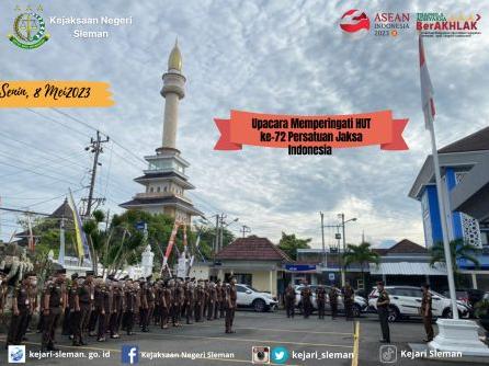 Sleman - Pada hari Senin tanggal 8 Mei 2023, Kepala Kejaksaan Negeri Sleman, Widagdo, S.H. pimpin upacara peringatan Hari Ulang Tahun ke-72 Persatuan Jaksa Indonesia diikuti oleh seluruh pegawai di halaman kantor Kejaksaan ...