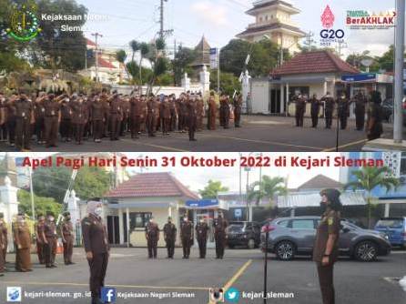 Apel Pagi pada hari Senin tanggal 24 Oktober 2022 di kantor Kejaksaan Negeri Sleman diikuti oleh seluruh pegawai Kejaksaan Negeri Sleman. #KejaksaanRI #JaksaAgung #kejarisleman #kejatijogja #kejaksaanhebat #Berintegritas #KerjaCerdas #MelayaniDenganIkhlas #terusbergerakdanberkarya #adhyaksa #trapsilaadhyaksa #jaksa ...