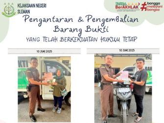 Kejaksaan Negeri Sleman telah melaksanakan pengembalian barang bukti yang telah berkekuatan hukum tetap (inkracht) dalam dua perkara tindak pidana, sebagai berikut:Perkara Tindak Pidana Penipuan (Pasal 378 KUHP)Barang bukti yang diserahkan:• 1 (satu) buah ...