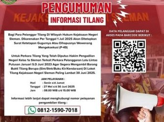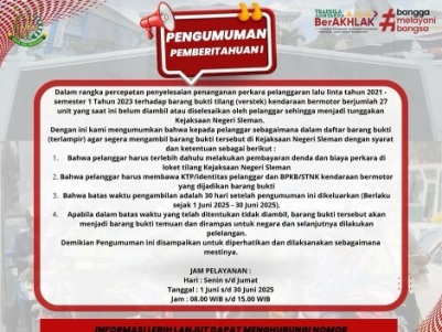 **PENGUMUMAN I**Kami mengimbau kepada para pelanggar lalu lintas (tilang) periode 2021-semester I 2023 yang belum menyelesaikan pembayaran denda dan biaya perkara untuk segera mengambil barang bukti tilang kendaraan bermotor di Kejaksaan Negeri Sleman ...