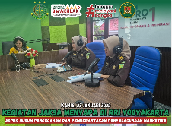 Kegiatan "Jaksa Menyapa" di RRI Yogyakarta mengangkat tema "Aspek Hukum Pencegahan dan Pemberantasan Penyalahgunaan Narkotika".Dalam kesempatan ini, Kejaksaan Negeri Sleman diwakili oleh Jaksa Fungsional pada Seksi Intelijen, Erica Normasari, S.H., dan Adinda Hapsari, ...