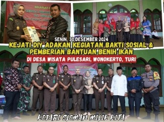 Senin, 30 Desember 2024 Kepala Kejaksaan Tinggi DIY, Ahelya Abustam, S.H., M.H., bersama Kepala Kejaksaan Negeri Sleman, Bambang Yunianto, S.H., M.H., serta para asisten dari Kejaksaan Tinggi DIY, mengunjungi Desa Wisata Pulesari dalam rangkaian ...