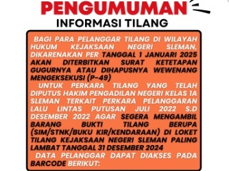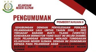 **PENGUMUMAN II** Kami mengimbau kepada para pelanggar lalu lintas (tilang) periode 2020-2021 yang belum menyelesaikan pembayaran denda dan biaya perkara untuk segera mengambil barang bukti tilangnya di Kejaksaan Negeri Sleman pada hari dan jam ...