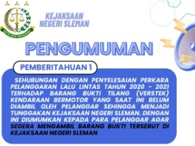 Kami mengimbau kepada para pelanggar lalu lintas (tilang) periode 2020-2021 yang belum menyelesaikan pembayaran denda dan biaya perkara untuk segera mengambil barang bukti tilangnya di Kejaksaan Negeri Sleman pada hari dan jam kerja. ...