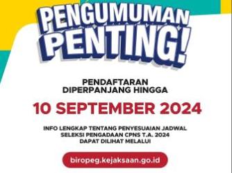 Repost from @biropegkejaksaan Sehubungan dengan terjadinya kendala teknis pada sistem meterai elektronik, pendaftaran CPNS Kejaksaan RI Tahun 2024 diperpanjang hingga *10 September 2024*. Manfaatkan sisa waktu dan pastikan segera submit untuk menghindari potensi kegagalan ...
