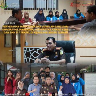 Penyerahan mahasiswa magang dari Fakultas Hukum Universitas Janabadra dan Universitas Ahmad Yani serta siswa magang dari SMKN 1 Tempel. Penyerahan dari pihak kampus/sekolah ke Kejaksaan Negeri Sleman yg diterima langsung oleh Kepala Kejaksaan ...