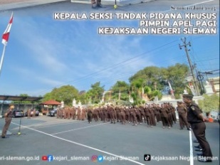 Apel Pagi hari Senin, tanggal 10 Juni 2024 di halaman kantor Kejaksaan Negeri Sleman dipimpin oleh Kepala Seksi Tindak Pidana Khusus, Indra Aprio Handry Saragih S.H. diikuti diikuti Para Kasi, Kasubag dan seluruh ...