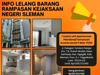Kejaksaan Negeri Sleman akan melakukan Lelang Eksekusi Barang Rampasan Negara dengan perantara Kantor Pelayanan Kekayaan Negara dan Lelang (KPKNL) Yogyakarta berdasarkan Putusan Pengadilan Negeri Sleman Nomor: 31/Pid.Sus/2024/PN Smn Hari Rabu Tanggal 20 Maret ...
